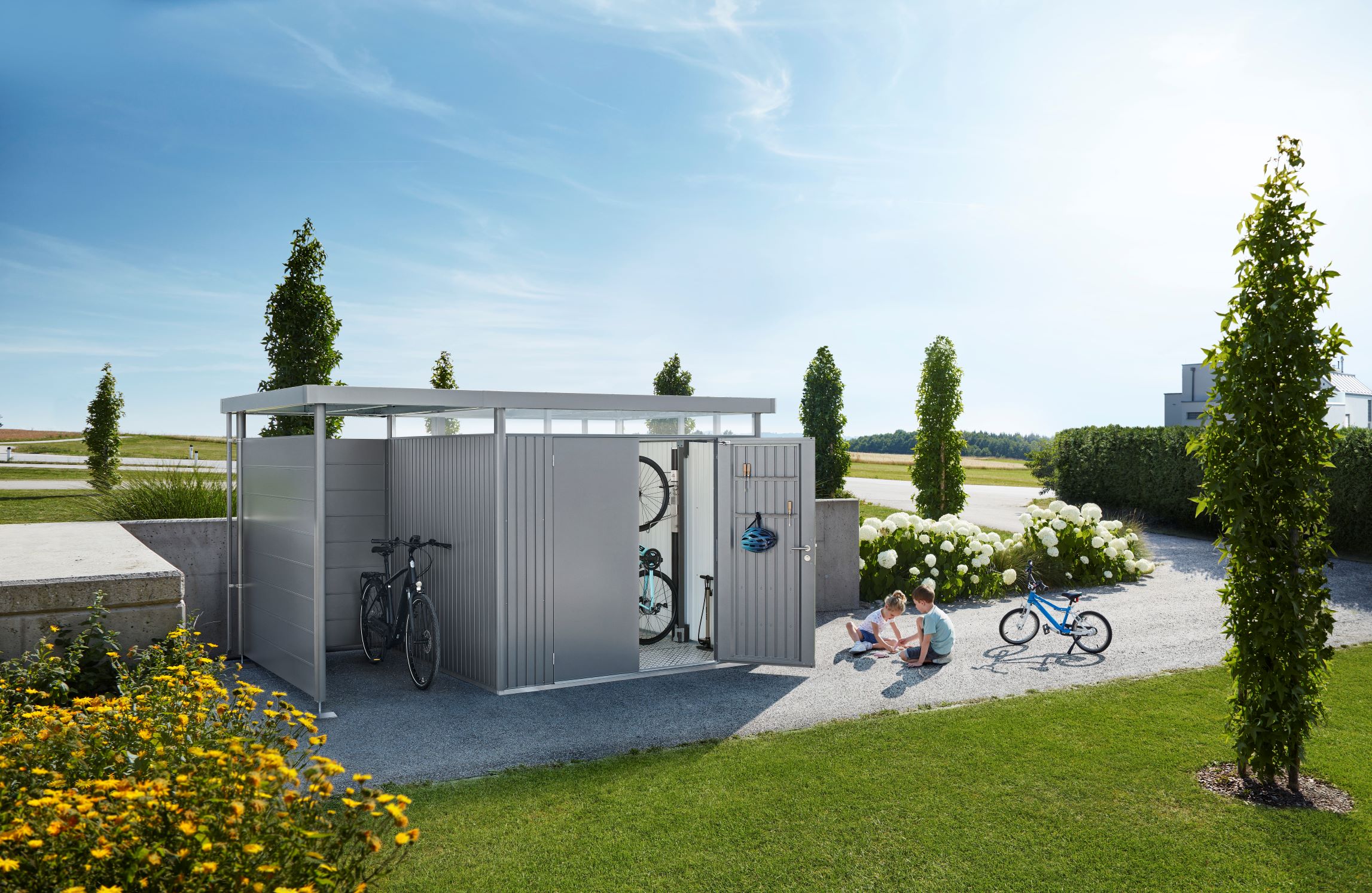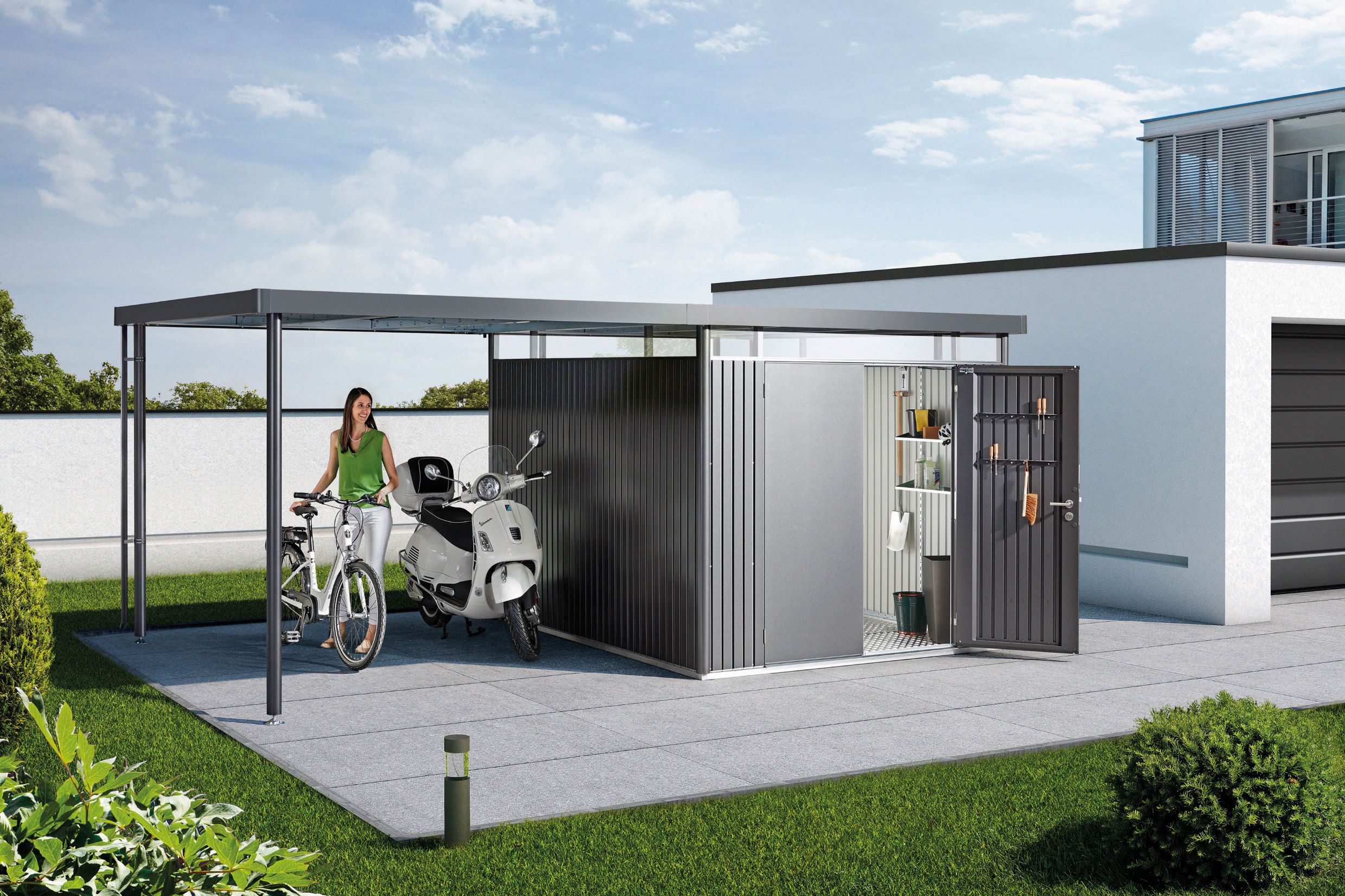 Moderní zahradní domek Biohort z řady HighLine v barevném provedení stříbrné metalízy a s dvoukřídlými dveřmi. Celý popis produktu