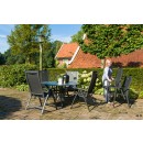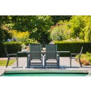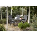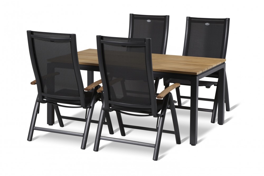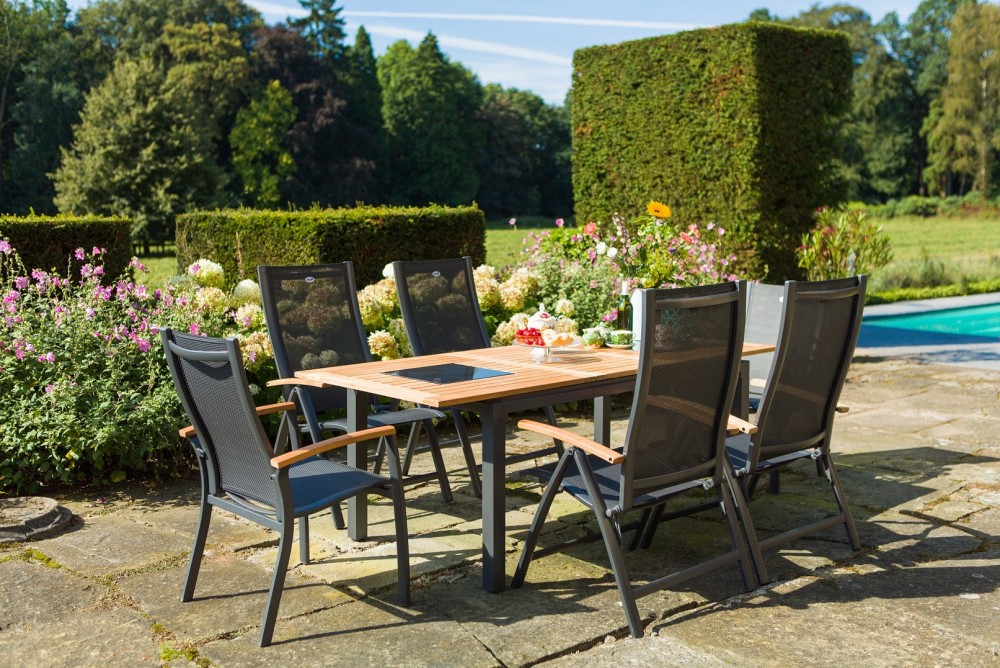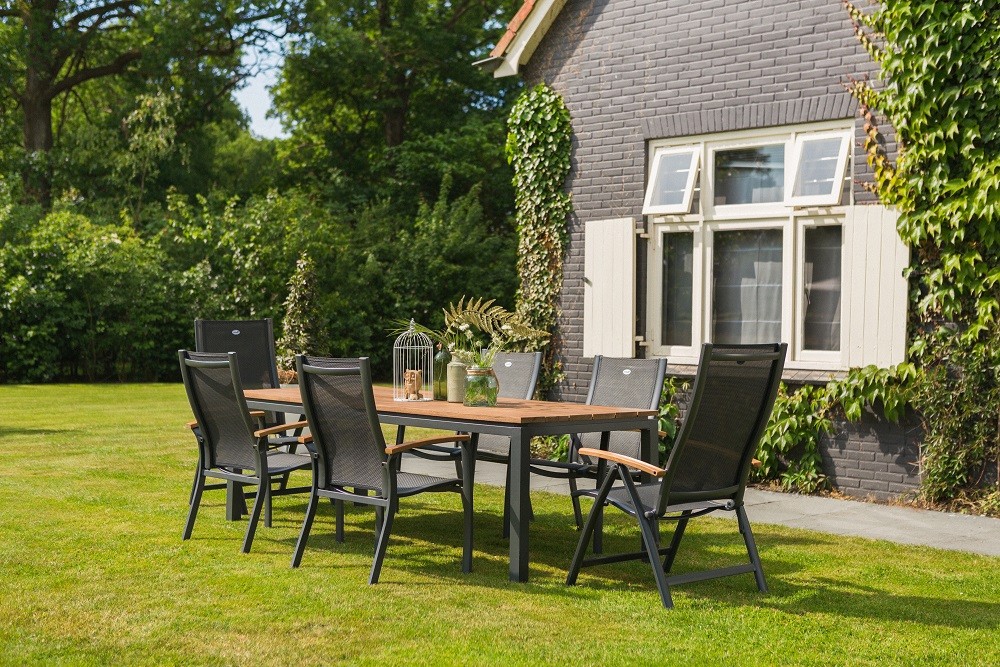 Elegantní stolovací židle Belcampo mají kostru vyrobenou z pevné hliníkové slitiny, která je doplněna textylenovým výpletem. Designovým prvkem jsou zde navíc područky z týkového dřeva. Tyto použité materiály mají několik shodných předností. Za prvé jsou vysoce odolné vůči různým povětrnostním vlivům, povrchovým poškozením i nečistotám vznikajícím při stolování. Například látka použitá ve výpletu se nepropíná, vždy zůstane napnuta či také nenasákne vodu. Díky tomu mohou zůstat tyto židle celoročně venku a vy se můžete spolehnout, že vám výborně poslouží po mnoho let.