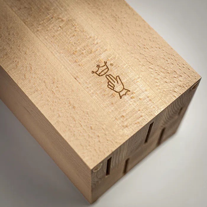 Blok z masivního bukového dřeva bezpečně drží nože na místě a zároveň slouží jako elegantní dekorace kuchyňské linky.