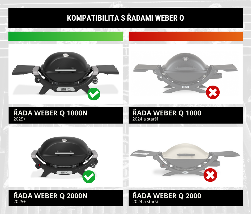 Pozor, není určen pro plynové grily roku výroby 2024 a starší - ty mají trošku jiný tvar a vozík by k nim nepasoval. Jedná se o grily s označením bez "N" na konci (tedy například Weber Q 1200). Není určen ani pro elektrické grily Weber Q 2400.