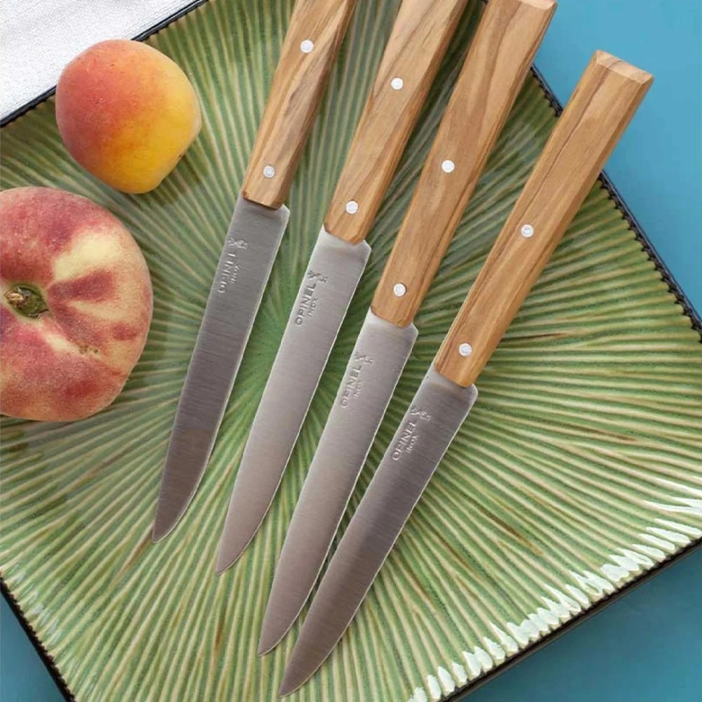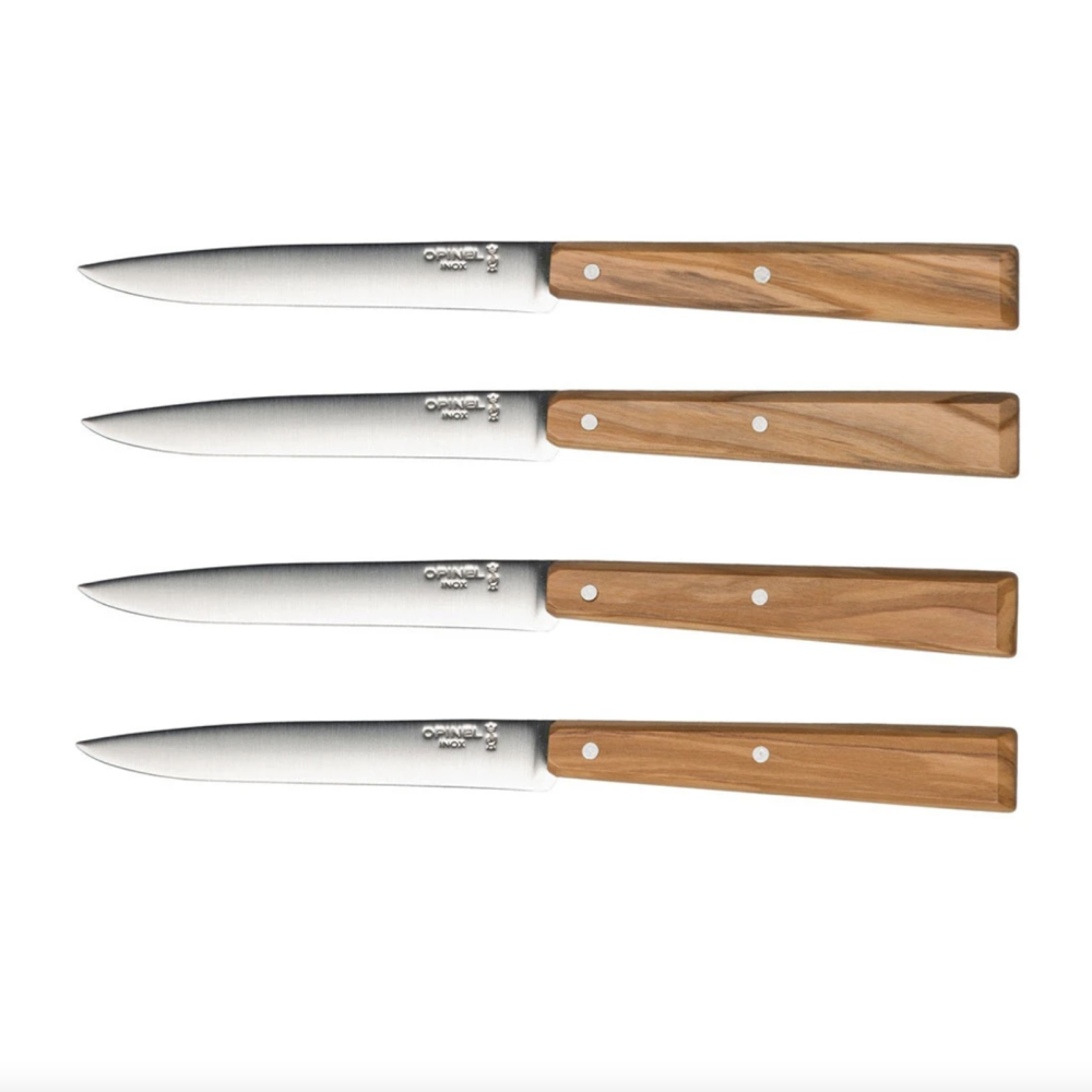 Luxusní sada steakových nožů Opinel obsahuje čtyři ostré nože z nerezové oceli Sandvik 12C27 a s rukojetí z krásného olivového dřeva.